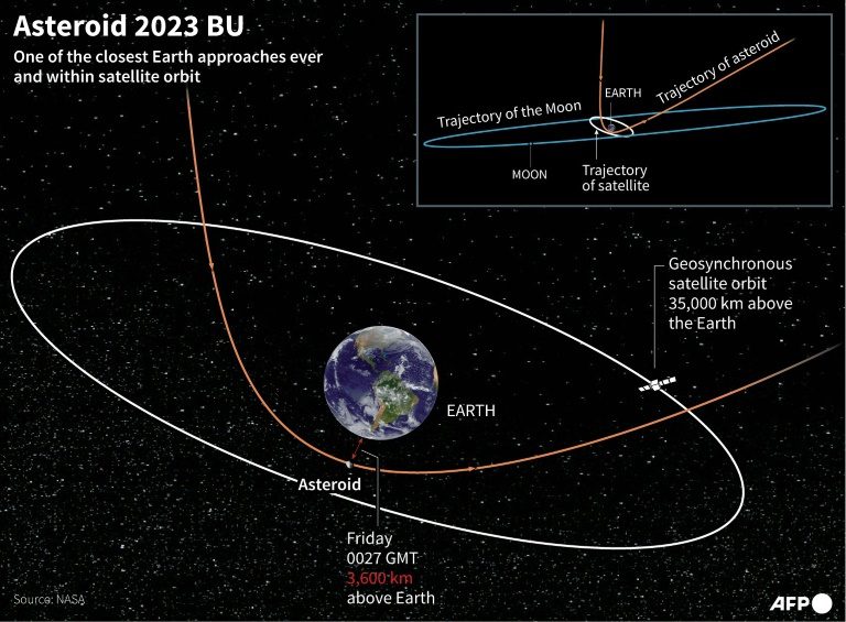 Graphic showing the predicted trajectory of asteroid, 2023 BU, which will pass near Earth, one of the closest approaches to our planet ever recorded, at 4:27 p.m. (PST) Thursday (00:27 GMT Friday), according to NASA.AFP