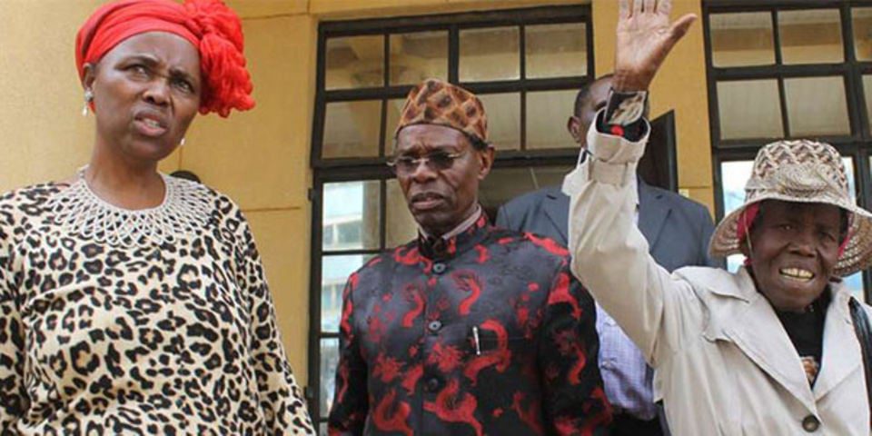 Mrs Monica Wangu Wamwere (right), Former Subukia MP Koigi wa Wamwere (centre) and Mrs Nduta wa Koigi (left) outside Milimani Law Courts in April 2016./Courtesy