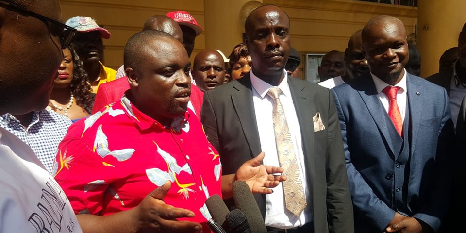 Korogocho MCA Absalom Odhiambo (left) addresses media outside Milimani Commercial Law Courts after being freed for being arraigned on a non-existent law. With him is his lawyer Danstan Omari (centre) and Sam Nyaberi./Courtesy
