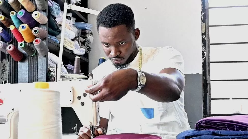 “Since I was born I have never experienced stable power supply. We call ourselves the giant of Africa but we can’t fix electricity,” complains Mr Adah as he works on a buttonhole.