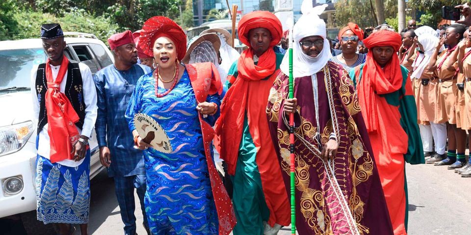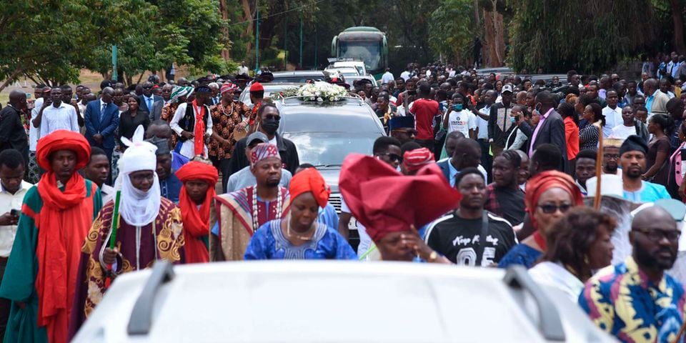 Behind the hearse, traditional dancers with green and red striped hats beat their drums, raised their palm sticks and beat their bells, singing to the man they called an achiever and a king who does not die but transits.