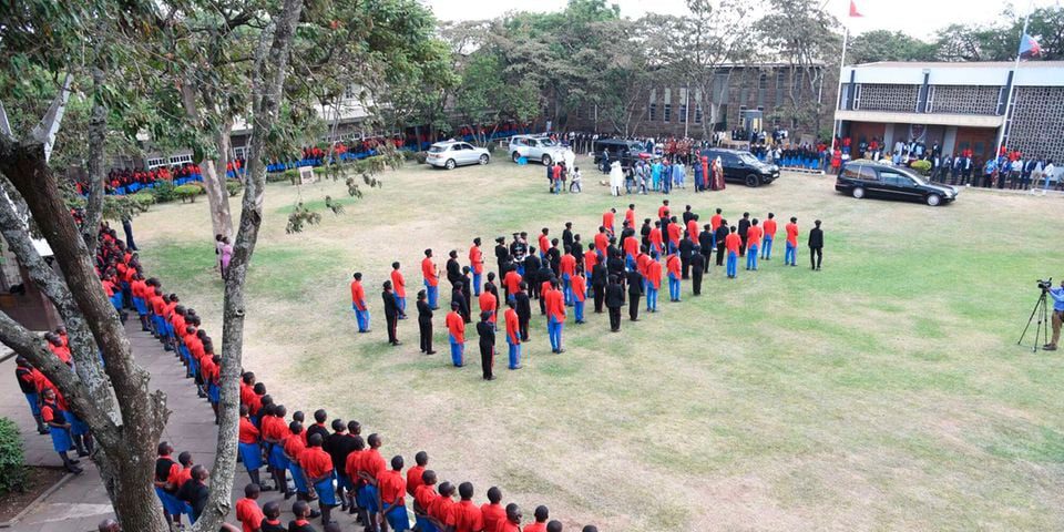 At Starehe Boys Centre, his hearse rested before the administration block, a band on its left, which played hymns and dirges. For an hour, the hearse stood unmoved, as Mrs Barbara Magoha and her family engaged with the students.