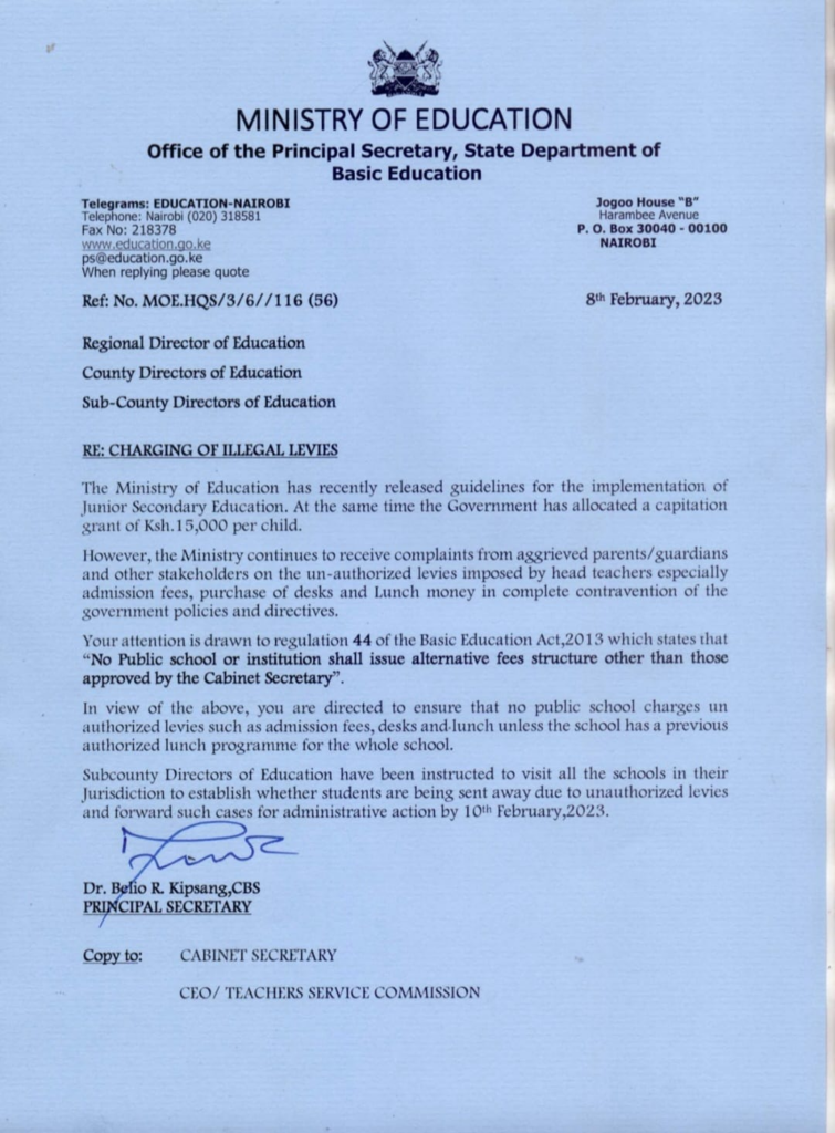 In a circular issued by Education Principal Secretary Belio Kipsang, Regional, County, and Sub-County Directors of Education were directed to move with speed and probe schools imposing illegal charges on parents.