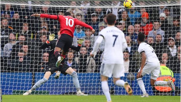 Three days on from Marcus Rashford netting the Red Devils’ first goal as they came back from 2-0 down at home to secure a Premier League draw, the England striker broke the deadlock when he rose to meet Luke Shaw’s curling cross to head past Illan Meslier for his 21st goal of a superb season.