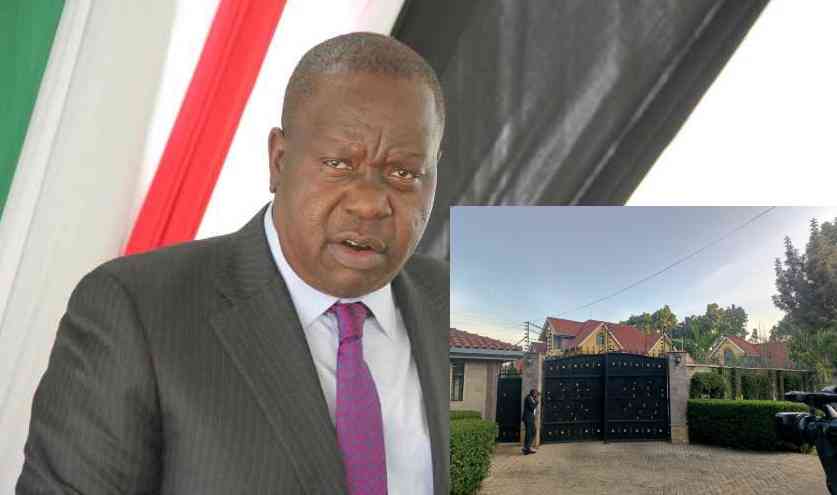 Former Interior CS Dr. Fred Matiang'i. Inset, the former CS's home in Karen, Nairobi. Detectives on Wednesday evening stormed into the home of the former Cabinet Secretary in Karen./Courtesy