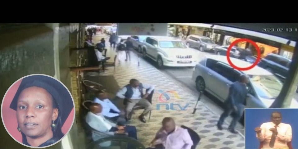 creengrab of CCTV footage showing the exact moment National Hospital Insurance Fund (NHIF) employee Lilian Waithera (inset) was shot while walking with a colleague along Kaunda Street in Nairobi city centre. A suspect in the shooting has been arrested./Courtesy
