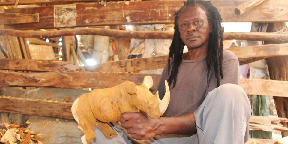 Sheltered under a makeshift workshop in Wamunyu township, Machakos County, Mutuku Kitala is momentarily lost in thought as he gouges the underbelly of a rhinoceros he has been carving for two days.