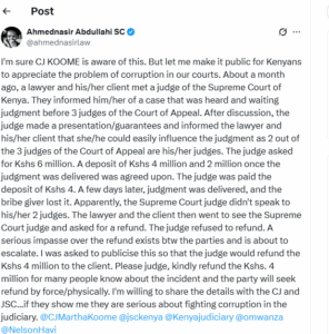 According to Ahmednasir’s posts on X (formerly Twitter), the judge allegedly refunded KSh 3 million after the bribe failed to yield a favorable verdict. The Senior Counsel also claimed he was owed KSh 1.5 million by the judge for his role in facilitating the transaction.