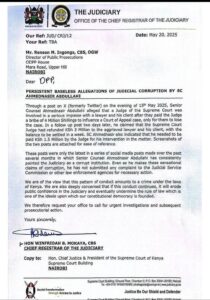 In a letter dated 20 May 2025, addressed to DPP Renson M. Ingonga, Chief Registrar of the Judiciary Hon. Winfridah B. Mokaya expressed concern over social media posts by Ahmednasir, claiming that a Supreme Court Judge accepted a KSh 4 million bribe to influence a Court of Appeal case.