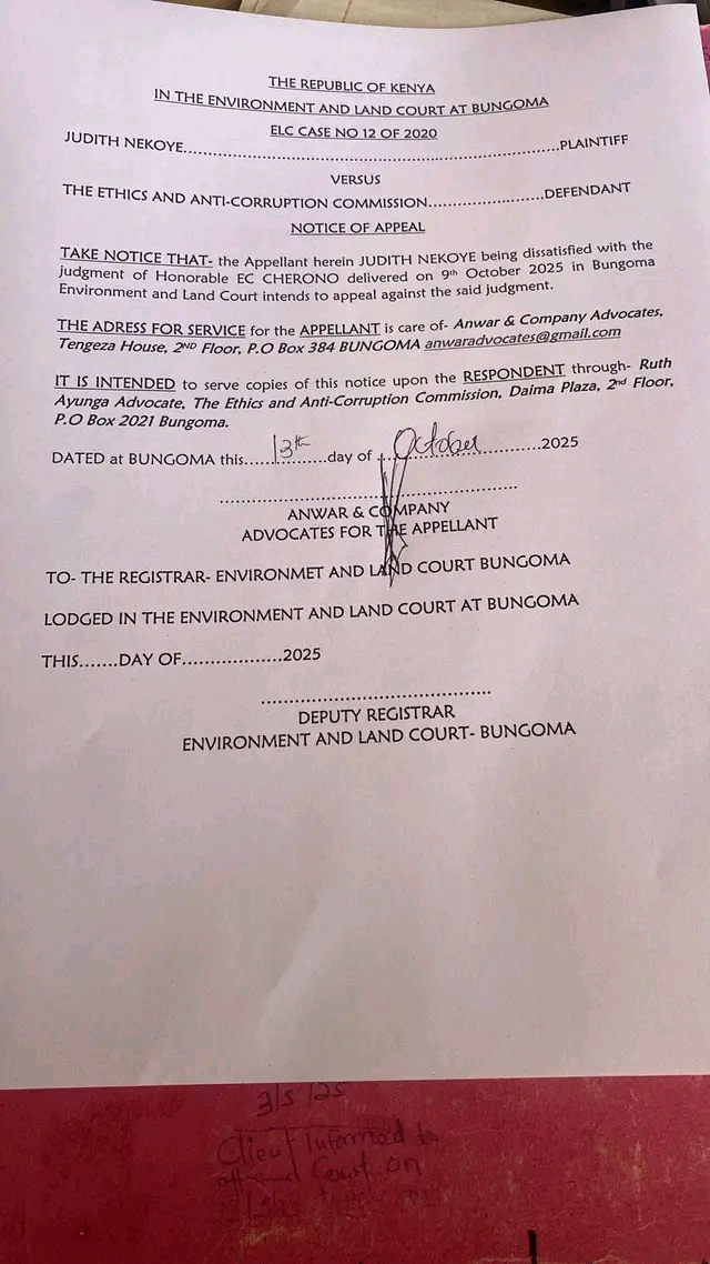 Nekoye, who had been declared an illegal occupant of the half-acre property, moved swiftly to contest the decision delivered by Justice Enock Cherono on October 9, 2025. In a Notice of Appeal dated October 13, 2025, her lawyers Anwar & Company Advocates informed the Environment and Land Court (ELC Case No. 12 of 2020) of her intention to challenge the ruling at a higher court.