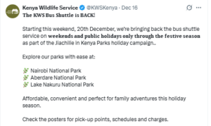 “Starting this weekend, 20th December, we’re bringing back the bus shuttle service on weekends and public holidays only through the festive season as part of the Jiachilie in Kenya Parks holiday campaign,” KWS wrote on X.